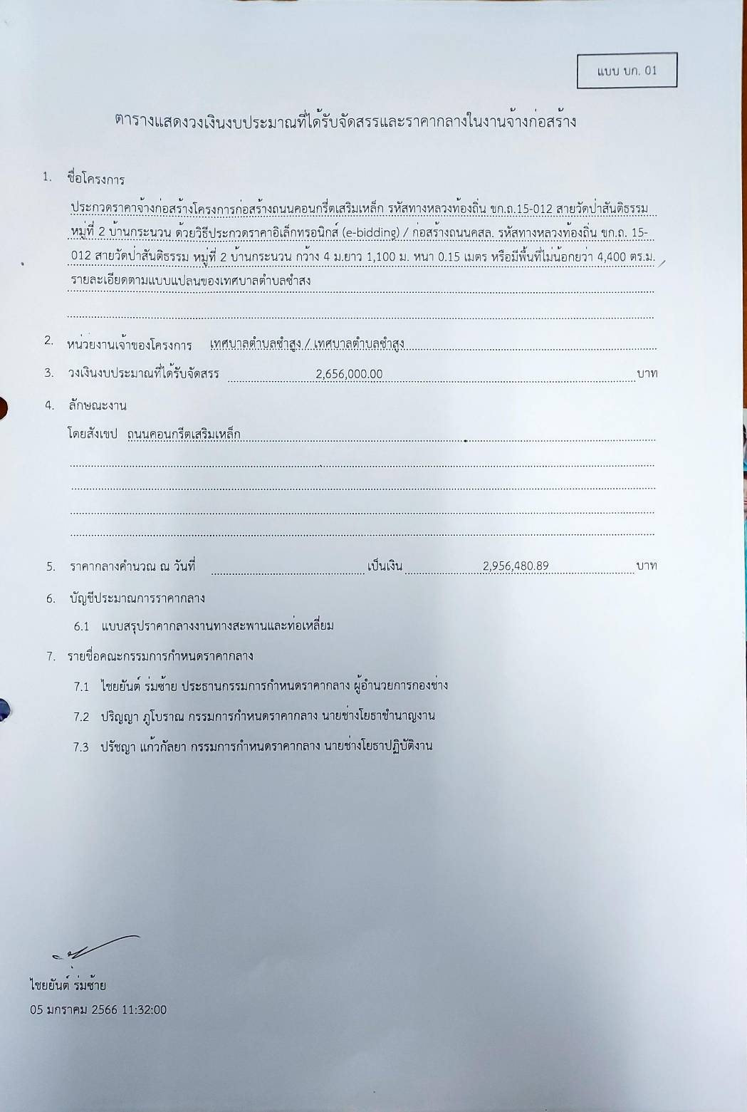 ประกาศผู้ชนะการเสนอราคาโครงการก่อสร้างถนนคอนกรีตเสริมเหล็กสายหนองบ่อ บ้านอ้อคำ หมู่ที่ 4